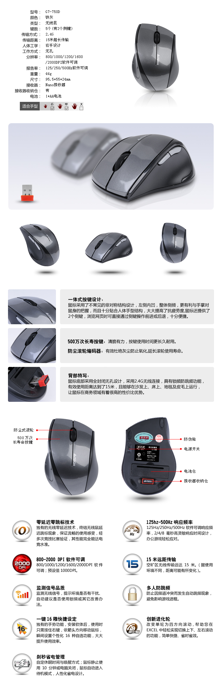 - 商品名称:双飞燕 A4Tech G7-750D无线无孔鼠标 黑色