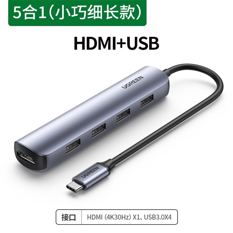 Type-C转HDMI+4口USB分线器(5G款)不带PD 分线器款 USB接口:USB 3.0(5Gbps) HDMI接口:4K/30Hz 材质:铝合金+ABS 线芯材质:镀锡铜 线长:200mm 彩盒包装